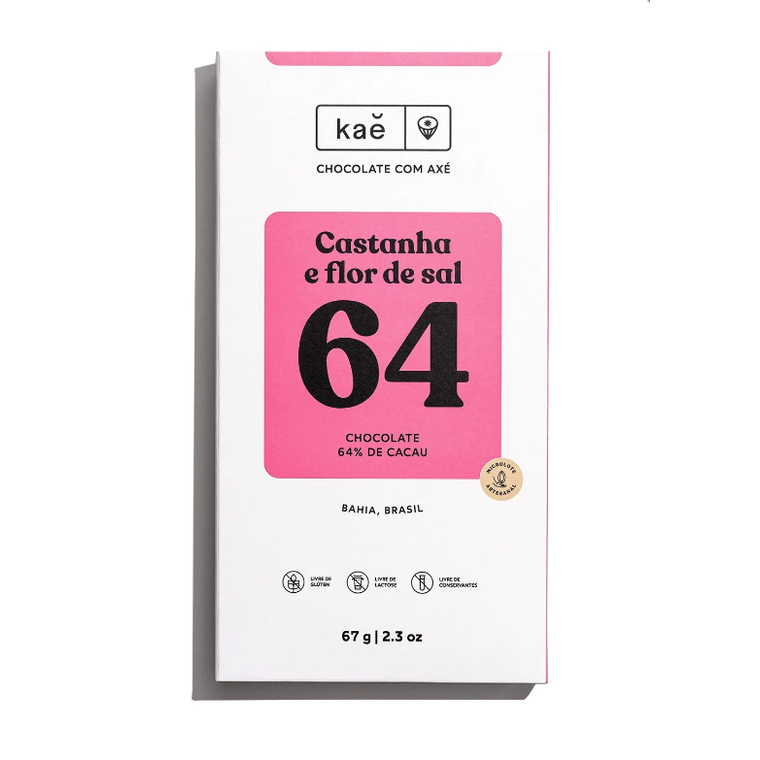 Chocolate 64% cacau com castanha e flor de sal é feito com cacau de altíssima qualidade, manteiga de cacau e açúcar demerara orgânico. Nada mais. Sem conservantes nem aromatizantes artificiais, mas com muito axé e borogodó!